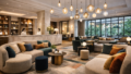 - 天井が高い吹き抜けのロビーラウンジと大きな本棚が印象的な空間