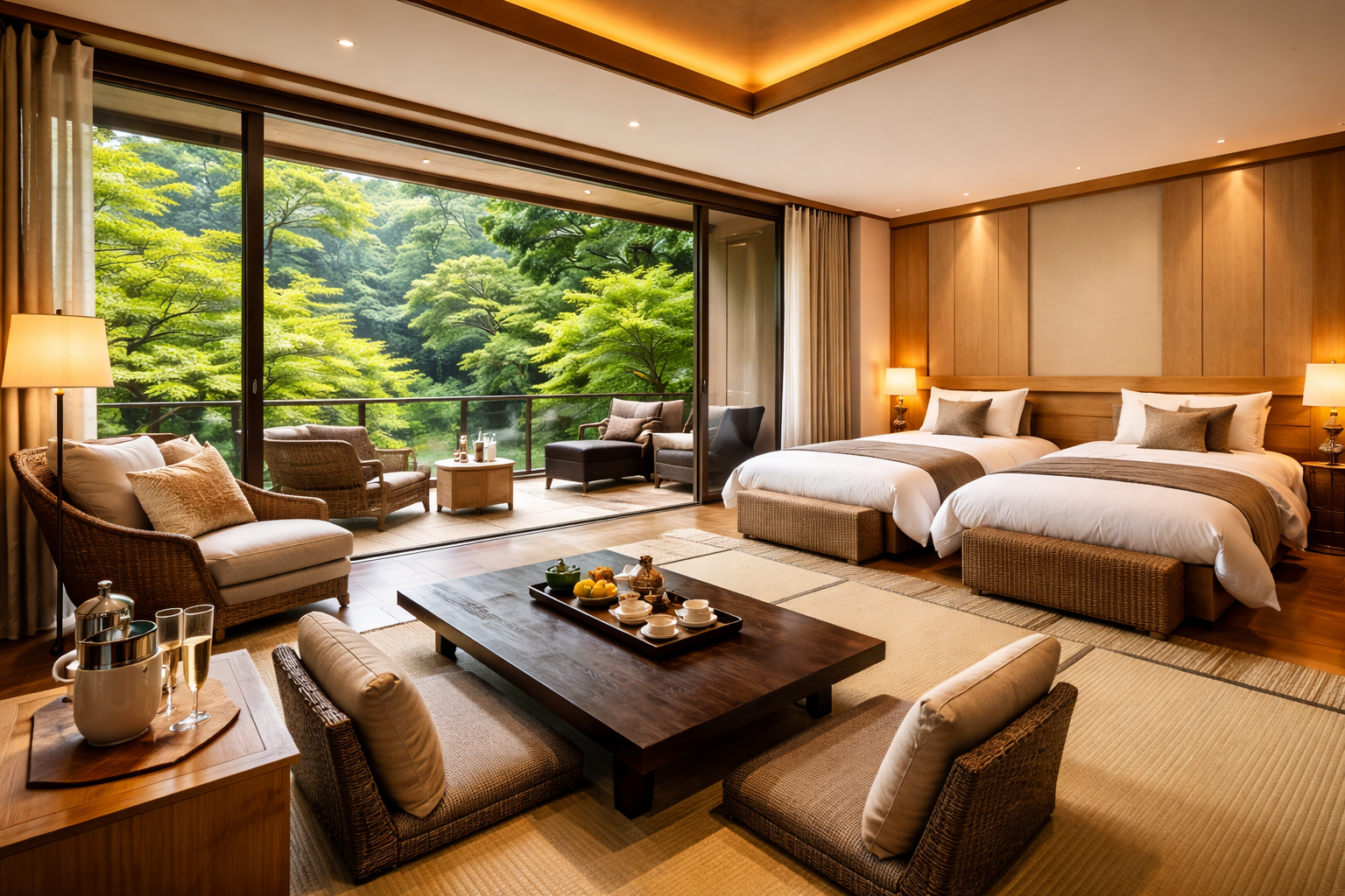 - 月の満ち欠けをテーマに、和とモダンが融合した洗練客室設計