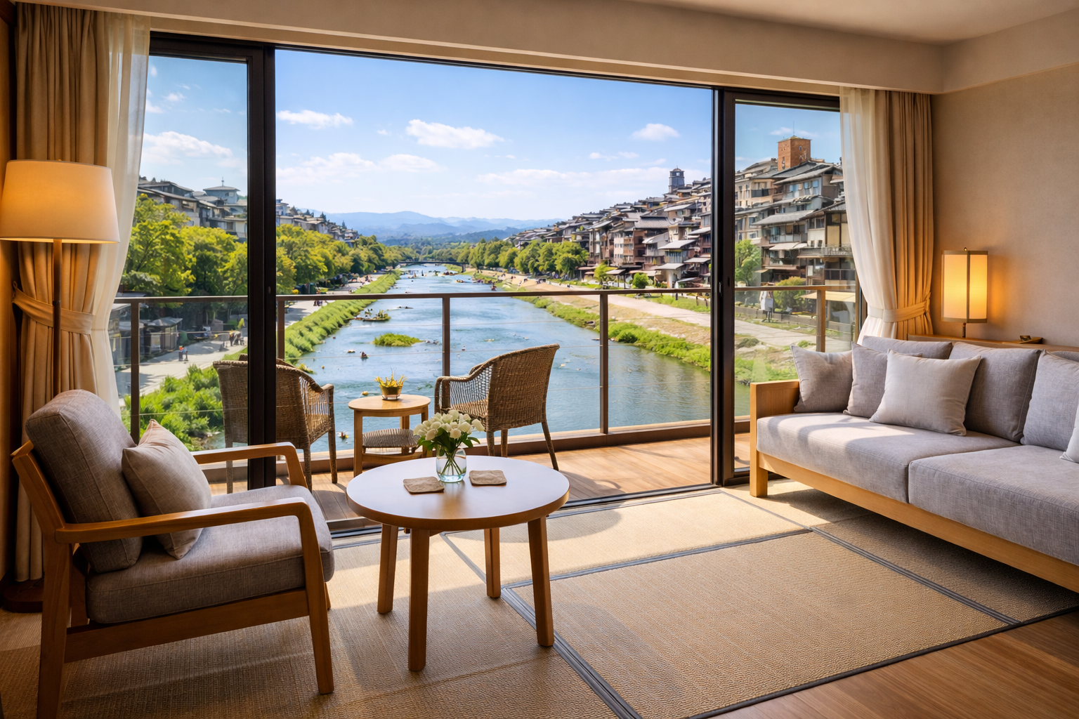 - 京阪神宮丸太町駅徒歩約3分、鴨川沿いの落ち着いたロケーションで静かに滞在できる環境