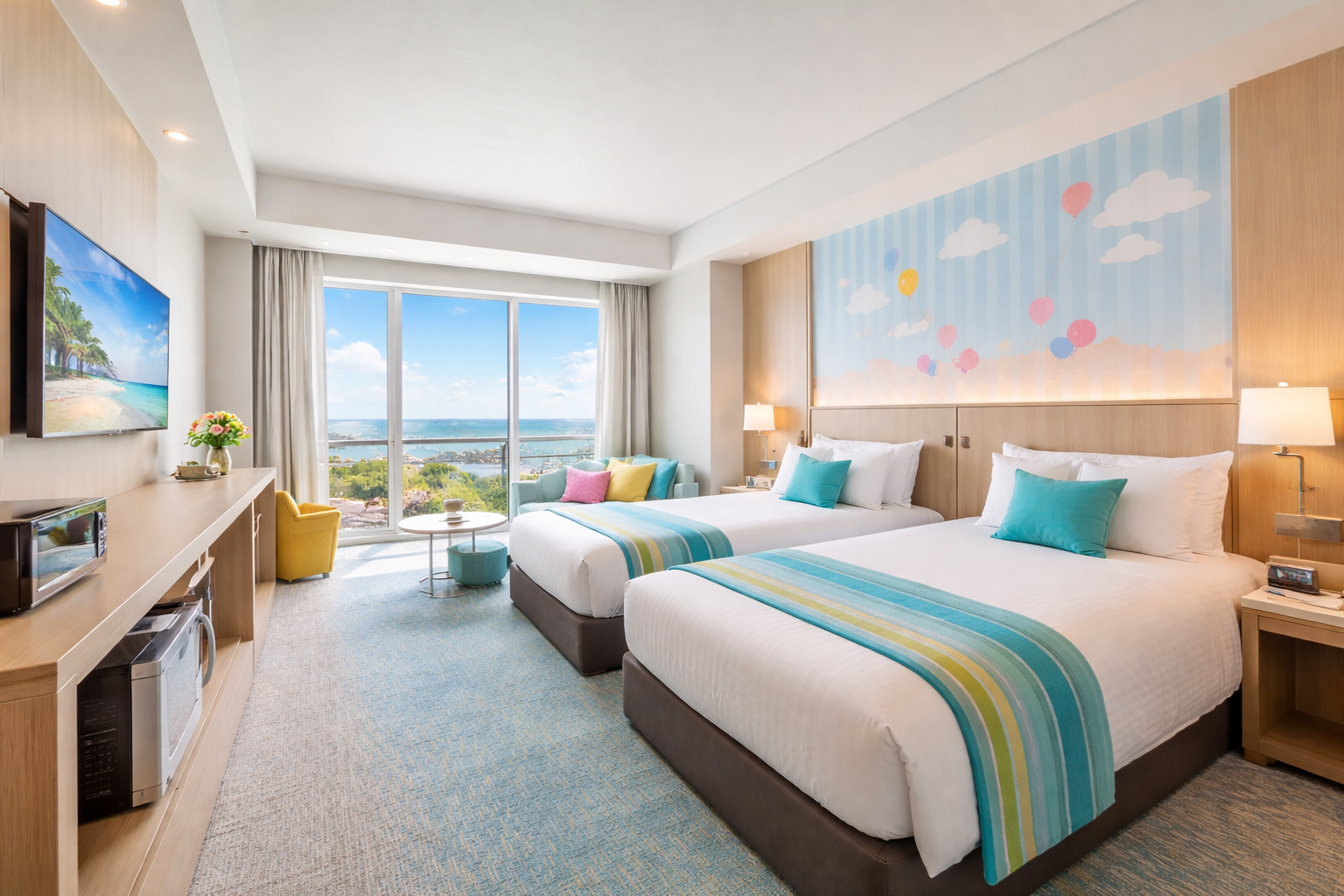 港町とファミリー向けデスティネーションをイメージした、カラフルで楽しいデザインが打ち出されていて、シンプルに泊まるだけでなく、ホテル滞在そのものも楽しみやすい一軒です。