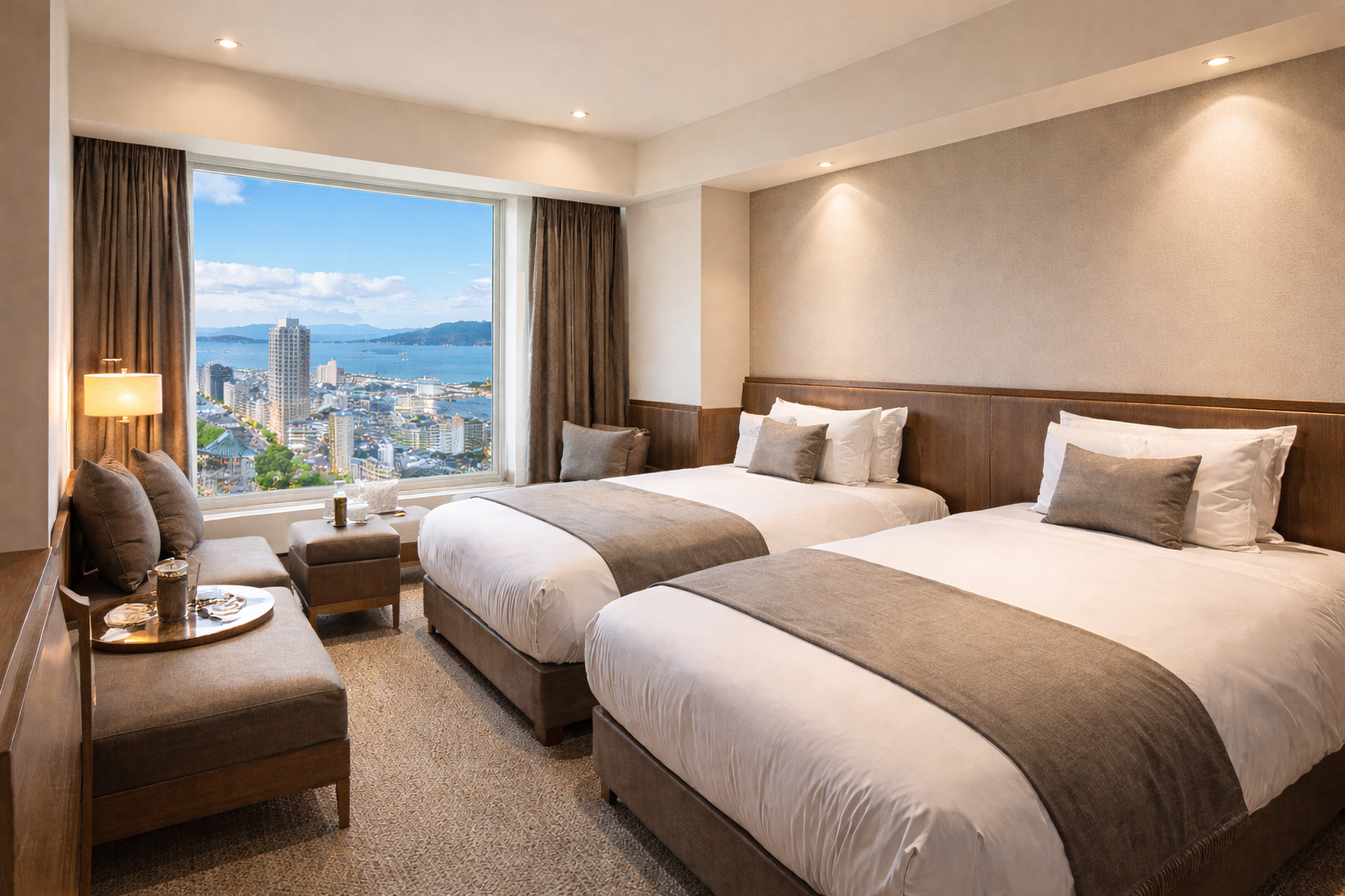 - 瀬戸内海や高松市街を望める客室があり、立地ならではの眺望を楽しめる