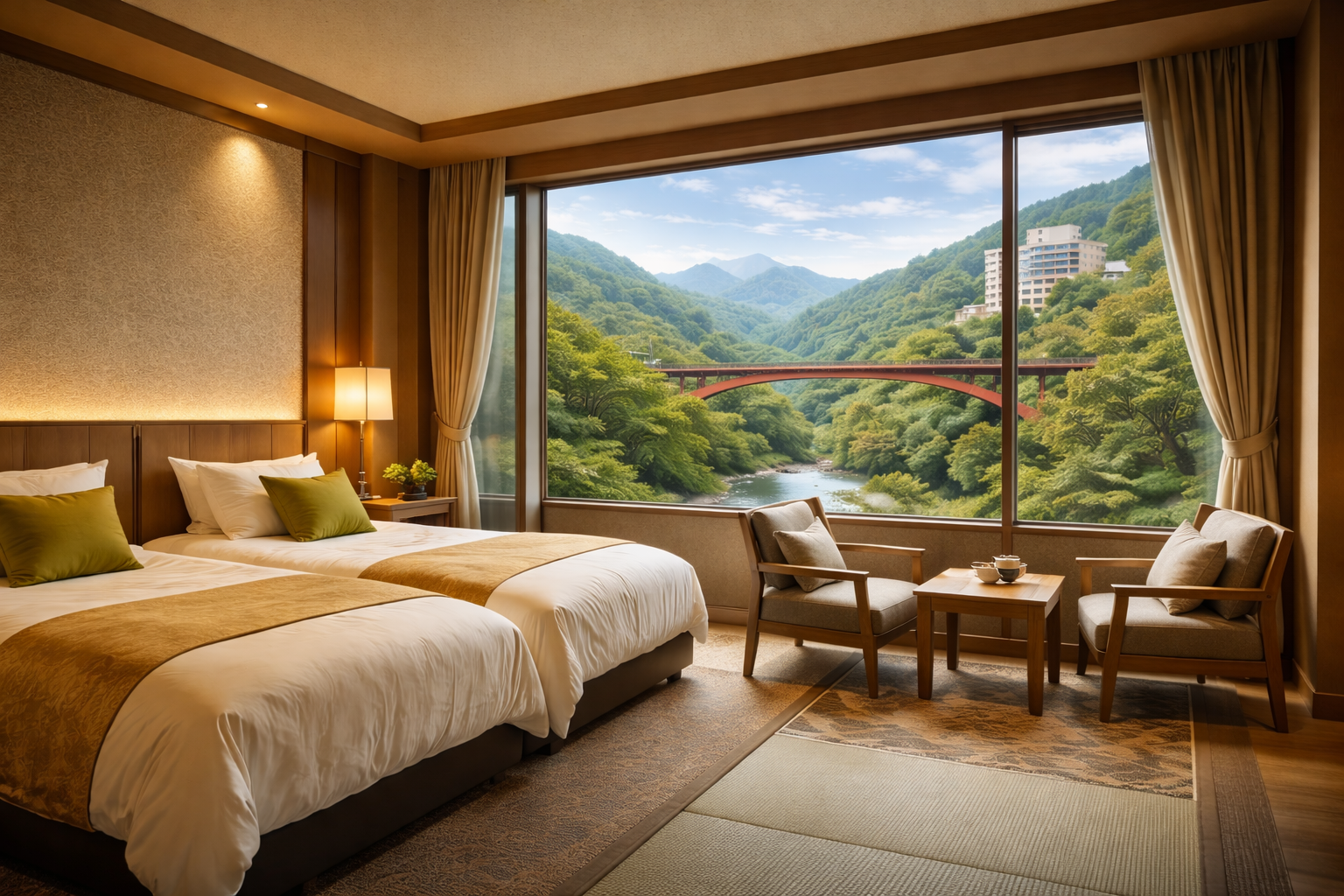 全室が渓谷に面し、多くの客室で温泉展望風呂を備えるなど、滞在の快適さが行き届いています。